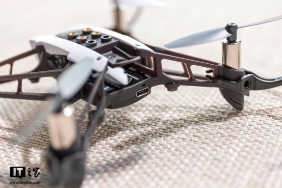 Parrot Mambo无人机的电池仓在机身尾巴上,电池仓下方还有一个USB充电口,标配的锂电池,容量为550mAh,官方表示续航有8分钟。
