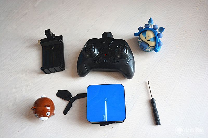 这是盒子里面的全部配件,可以说几百元价格非常超值。除了山猫口袋无人机,还有遥控器、手机支架、充电线、备用扇叶,还附带了一把螺丝刀。就说遥控器来说,也得价值几十元。