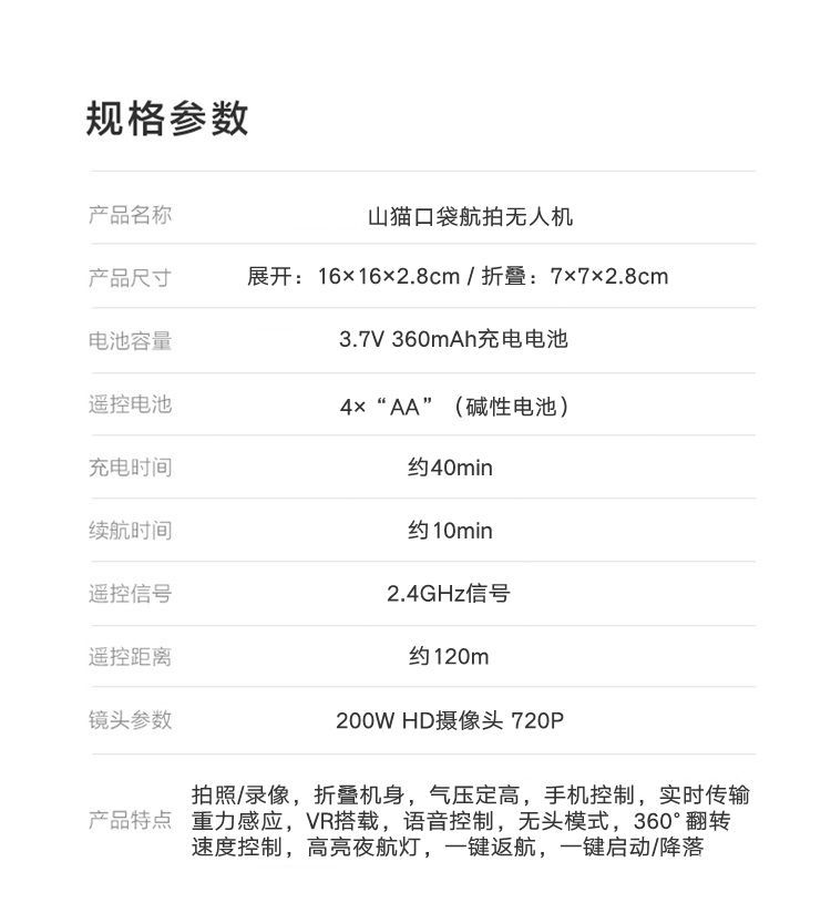 山猫无人机虽然价格便宜,可是也有很多优点。首先体积小,重量轻,可以折叠后放入口袋里随身携带。遥控距离远,最远达到120米,可以说比一般遥控飞机飞得高多了。而且还能在飞行过程中进行摄像和拍照。另外具有气压定高,手机和语音控制等黑科技。