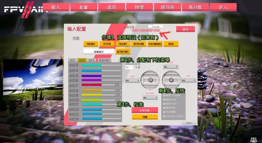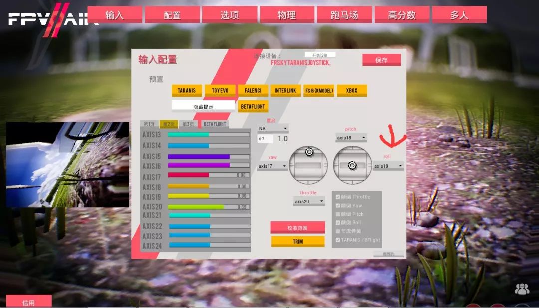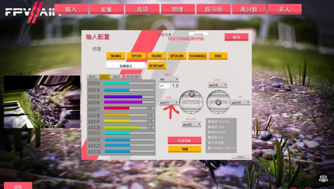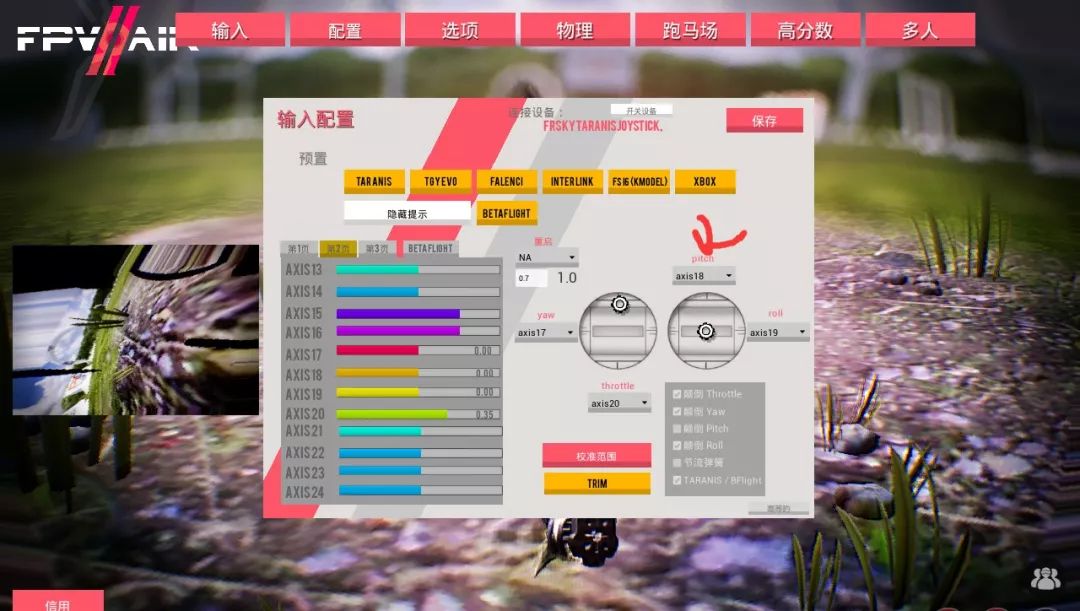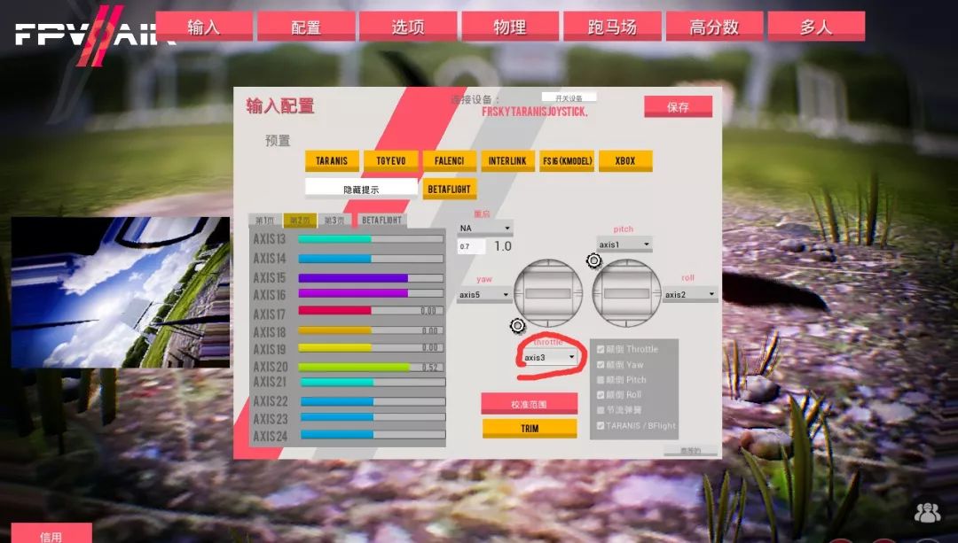 找出每个摇杆比如只动油门,会看到对应油门的axis轴序号进度条在动,在对应的摇杆位置上面,选择对应的序号,比如红圈对应的是油门通道