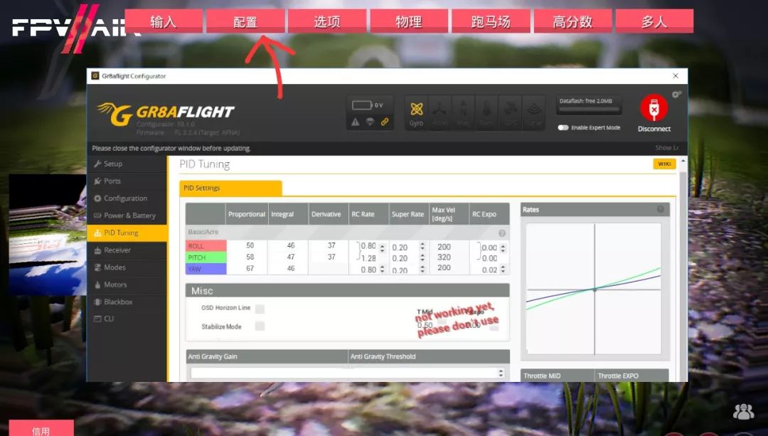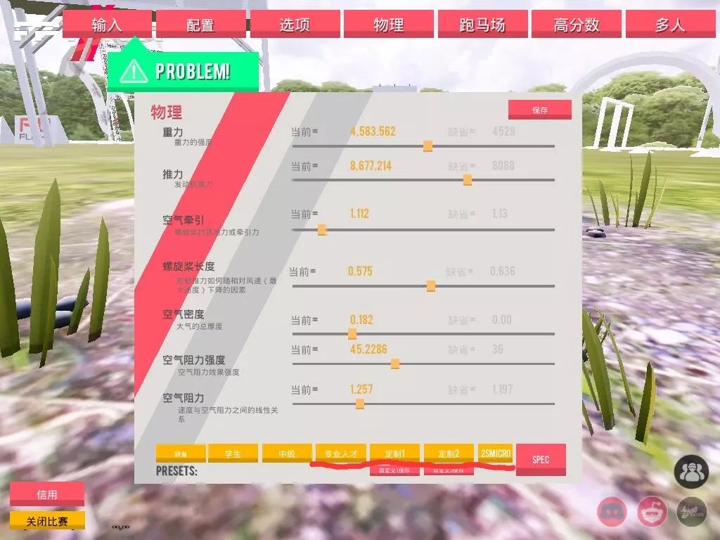 物理页面是设定一下模拟的参数,直接使用专业人才的预设就可以了,当然也可以自己调整一下,或者直接体验右边的SPEC参数(就是直接把电机推力调到顶)。