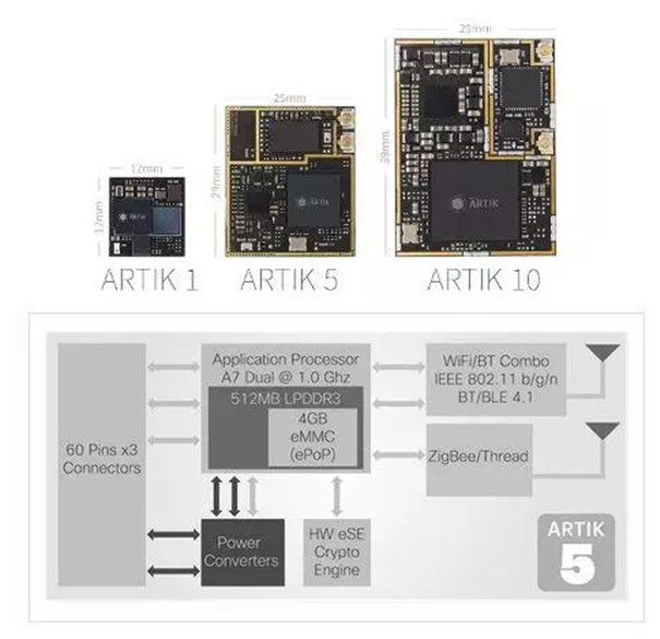 ARTIK 5 采用三星下一代ePoP封装技术,为广泛的设备和应用提供计算能力和存储容量的最佳组合,在性能和功耗之间实现平衡。集成有业界最佳的安全特性。