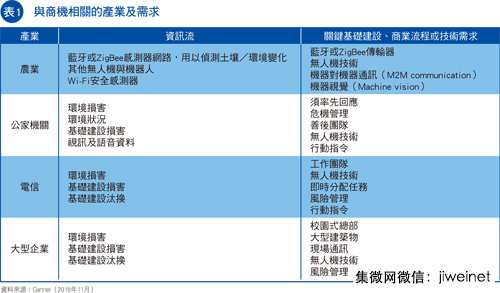 在这波商机中,我们证实了无人机与机器人技术针对特定网路需求增加变通性与反应时间的潜力。无人机还可以提供更大的覆盖范围,也能用更快且更具效率的方式替换受损网路。表1即详列了能将技术应用在这波商机的主要产业。