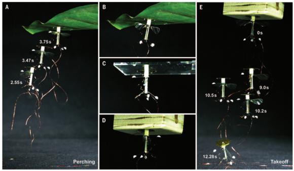 微型无人机利用静电吸附在不同物体表面降落和起飞(图片引自原论文)