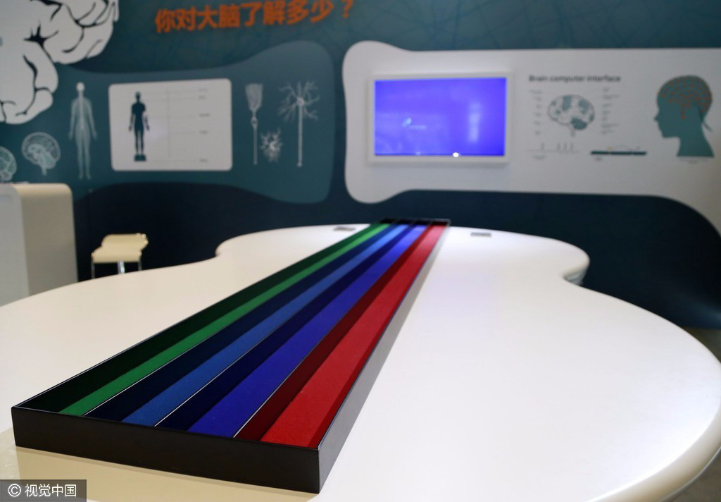 在梅江会展中心的二层就是颇受大家期待的技术空间展区,尤其是一款可以用“意念”操控小球向前运动的设备,让大家特别期待。体验者需要先佩戴一个脑电波接收器,通过这个接收器就可以向小球发布指令。