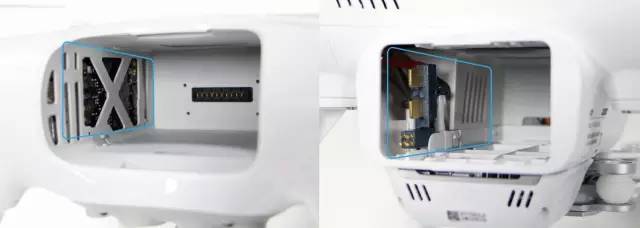 内部右壁。看到电池仓外部的电子部件,精灵4的宣传视频中有一个机体空中拆借图的镜头,可以看到电子部件采用了立体化、一体化设计。精灵3靠近机壳,仅看到几根排线穿插其中。相对来说,精灵4节省了空间,更好利用了以往没有利用的空间。