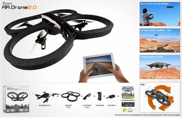2010年,Parrot用旗下的首款产品AR.Drone加入了四轴飞行器的阵营。这个模型采用聚苯乙烯泡沫制作的边缘,它搭载了两个相机,并可以通过WiFi连接iPhone来控制而不是传统的遥控器。它是通过两个超声波发射器、一个三轴加速度计和几个陀螺仪达到稳定。