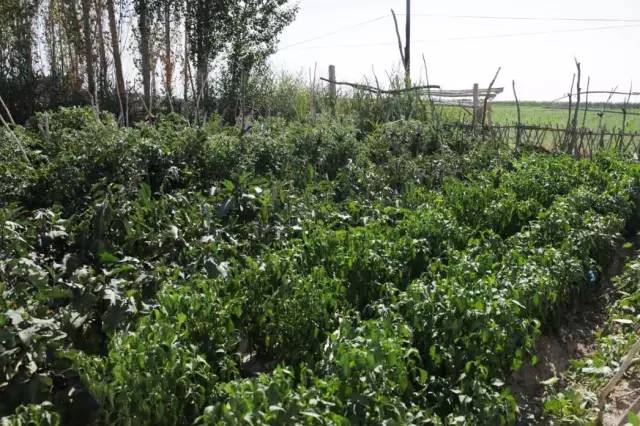 在新疆和硕服务点的菜园子里,圆嘟嘟的茄子已经接近丰收,西红柿已经结满了枝桠,黄瓜也长成了,花皮的西瓜也已经开花了,整个菜园子郁郁葱葱,一派生机盎然的景象。