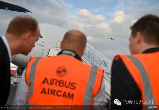 几名Airbus的工作人员在地面盯着中间这名工作人员手上的东西,而他身上的Airbus AIRCAM(空客空中相机)说明了他的身份,而远处在空客A380民航机上空飞着一架疑似无人机。