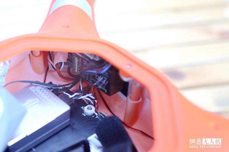 侧面可以看到边上的遥控器接收机以及白色的电调,但布线有些凌乱,在产品整机集成这块,厂商还需要加强。