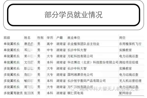 更加重要的是,毕业生就业得到了保障。从部分毕业学员就业的情况来看,有的直接去了供电公司,成为了电力巡线巡查的工作人员;有的涉足农业领域,开始了农业植保的工作;有的有的留在中科大智,成为了一名实操的教官;有的学员甚至准备自己创办无人机应用公司。