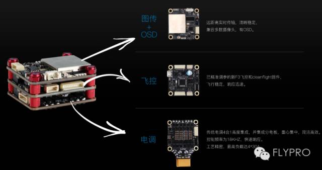 塔式飞控、电调、图传:优势是体积小,重量轻,布线少,重心集中,组装迅速,方便用户DIY。在专业穿越机上,为了达到更快的速度,机器就必须做到大桨,小机架(风阻小),重量轻。而小机架所面临的痛点就是线太多,布不下,而且也不美观。我们的塔式设备可以解决这一系列的问题。减重量也是所有飞行器所面临的最大挑战(尤其是竞速机上),少布线可以让飞行器更轻,飞行速度以及飞行时间会有所提升。