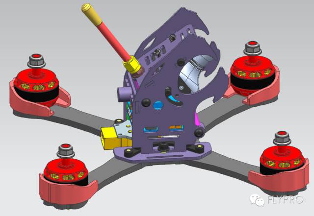 由于一部分炸机是由机臂先着地,我们特意把机臂头部更改比以前更大,这样防撞击能力更强;为了更美观还把机臂顶端做了一些小小的修饰,与之前的相比现在机臂已不再是一条线那么单调了;设计成豹爪的电机座造型也更美观。