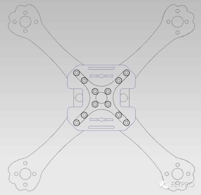 最初设计机架向外伸出的部分为直的,碳纤宽度16mm厚度3.5mm,此机架经过大量摔机测试强度已有过多的冗余设计;此设计足以保证在高速飞行出事故时不会机臂断裂,但此种形状的机臂有个缺陷,风阻过大且不美观;经过好几个日夜的讨论决定;最终把机臂形状由直线形改为圆弧形;削去多余部分减小了风阻和重量,增加速度和续航时间;但为做到万无一失,我们特意将机臂厚度由以前的3.5mm增加到4mm;尽可能的让机臂更强;另外还有一个细节,就是电机座我们改成豹子的爪子造型,配合豹头机身,更浑然一体,如图:
