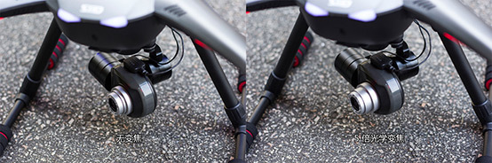 机身下方则是三轴防抖云台,云台下则是这款智航幻影自带的航拍相机了。相机的感官元件为 1/2.3 英寸 CMOS,1600 万像素,从镜头标注数值还能知道这款相机光圈范围在 F/3.2 - F/6.5 之间,而且这款相机还带有 5 倍光学变焦,等效焦距约为 28 - 140mm,基本还是满足监控拍摄的需求。