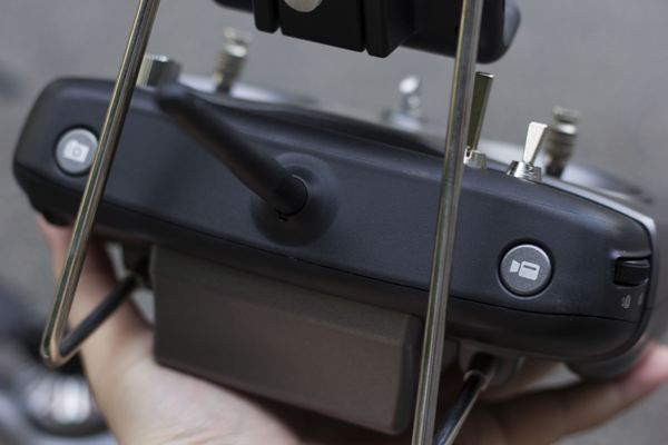 最右边的是遥控器电源键,长按开启或者关闭。为了提高无人机马达启动的安全性,专门在电源键旁边设置一个马达的解锁/锁定键,在起飞前和降落后都必须要确切按下这个锁定键才能完全关闭电机,以免发生误操作。而遥控器左上方则是智航幻影定制的功能拨杆,收纳脚架、飞行模式都可以在这里控制,右上方则是相机变焦遥控旋钮。