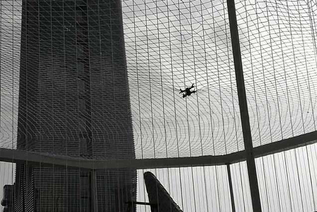 终于,在一两次试探之后,一直盘旋在对手下方的大个子无人机突然发难,猛然上升朝对手底部撞去,一次猛烈的碰撞之后,被解说员称为「小精灵」的小个子无人机急于上升躲避,没能控制住速度,一头撞上了顶部的防护网,螺旋桨卡在了网中,再也无法动弹。