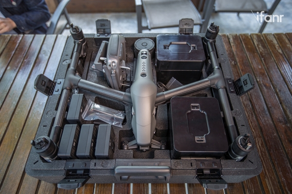 庞大的体型以及更加丰富的随机配件使得 Inspire 2 的包装箱体积非常可观,和一些专业级摄影器材的安全箱放在一起并没有太多的违和感。庞大的体积换来的是非常可观的装载能力。爱范儿(微信号:ifanr)拿到的这套 Inspire 2 共含有 4 块智能电池、1 台 Inspire 2 本体、2 台航拍相机(X4S / X5S)、1 个充电管家、1 个遥控器,以及充电器、CINESSD 存储卡等配件。考虑到这个箱子独立售价为 1699 元,装载能力强一点也是理所应当的。