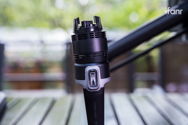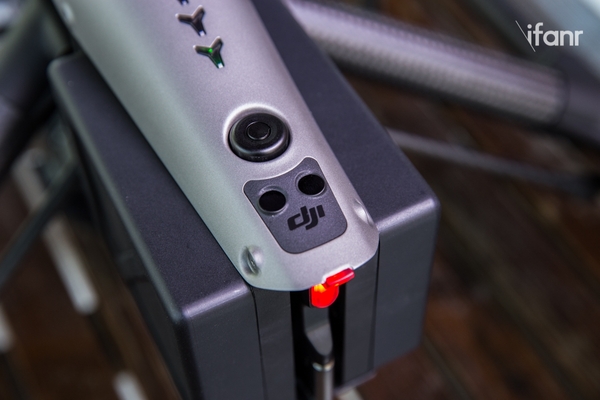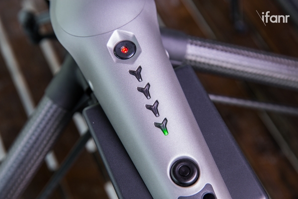由于电池从垂直插入变成了在尾部插入,所以 Inspire 1 顶部原有的电池开口被“消灭”,但四个 Y 形电量指示灯和电源键得到了保留。在电量指示灯后面,就是一个电池锁以及两个红外线上视感知系统,这套感知系统可以确保无人机在上升过程中不会碰到障碍物,方便飞手在室内飞行。