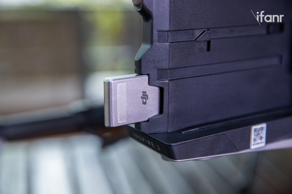 Inspire 2 的相机与无人机本体的配合度非常高,存储系统(SD 卡和 CINESSD 存储卡插槽)、影像处理系统 CineCore 2.0 均独立于相机模块被植入到无人机本体里。爱范儿(微信号:ifanr)此次拿到了 120GB 和 480GB 两块 CINESSD 存储卡,需要通过大疆开发的 CINESSD 读卡器与电脑相连。这样的独立设计有利于降低相机模块的尺寸。