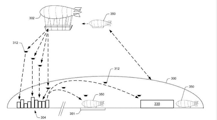 无人机送货规模运作的关键点在于“航空物流中心”(AFC,airborne fulfillment centers),有点类似于一个空中站点,货物像是储存在齐柏林空中飞艇(zeppelin)中。亚马逊要选择一个合适的位置安置飞艇,同时会用户根据需求进行转移并悬停在空中大概45000英尺的位置,既能储存大量货物,又能在有需求的时候及时配送。