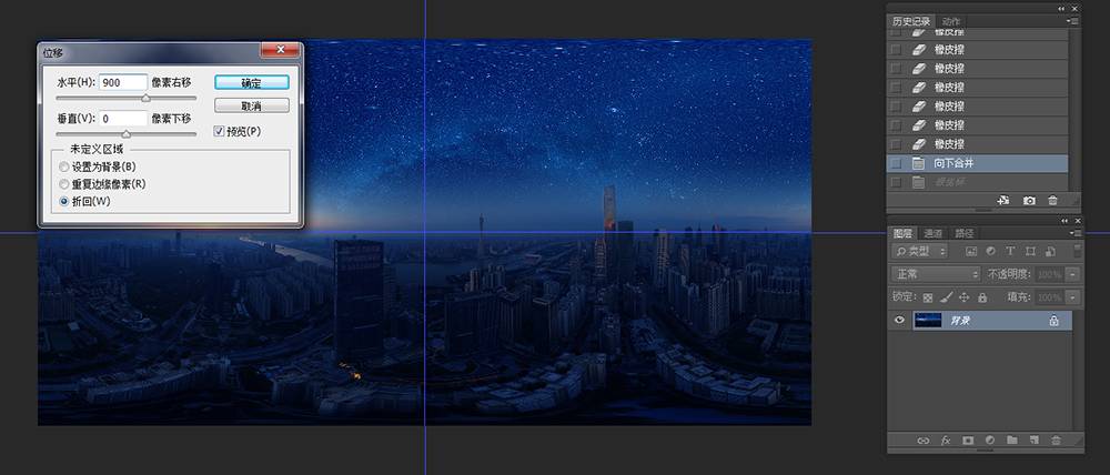 在菜单中点击:滤镜-其它-位移,然后输入数值(一般是长边的一半像素)。这样就可以用参考线检查接口位置是否出现痕迹。如果有就可以使用仿制图章工具进行修补。