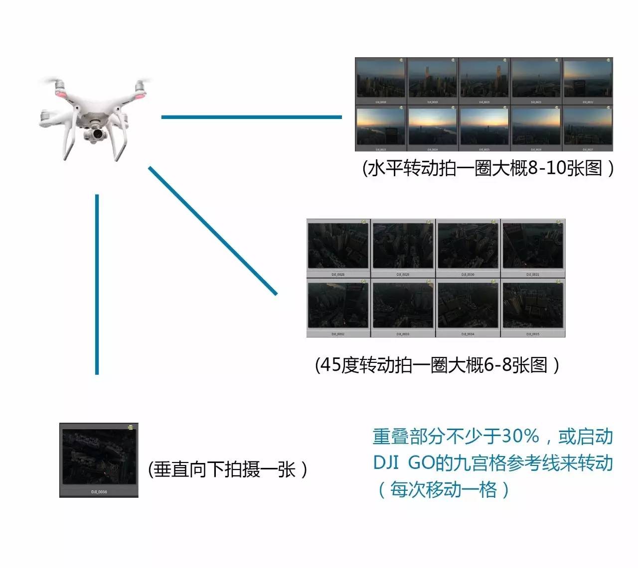 受访者提醒,如果航拍高度低于100米时,拍摄较靠近主体,视场切割画面变窄,通常会转3圈拍摄(就是水平一圈,向下30°一圈,60°一圈,加垂直一张),以保证合成的时候有足够的重叠画面,避免出现图像缺失或者变形难合成的现象。另外,如果使用Mavic Pro、Phantom 4 Pro等设备,因为焦距变长,在航拍全景时,通常会转3圈甚至4圈以保证图像完整,并加上一张垂直拍摄的图片。