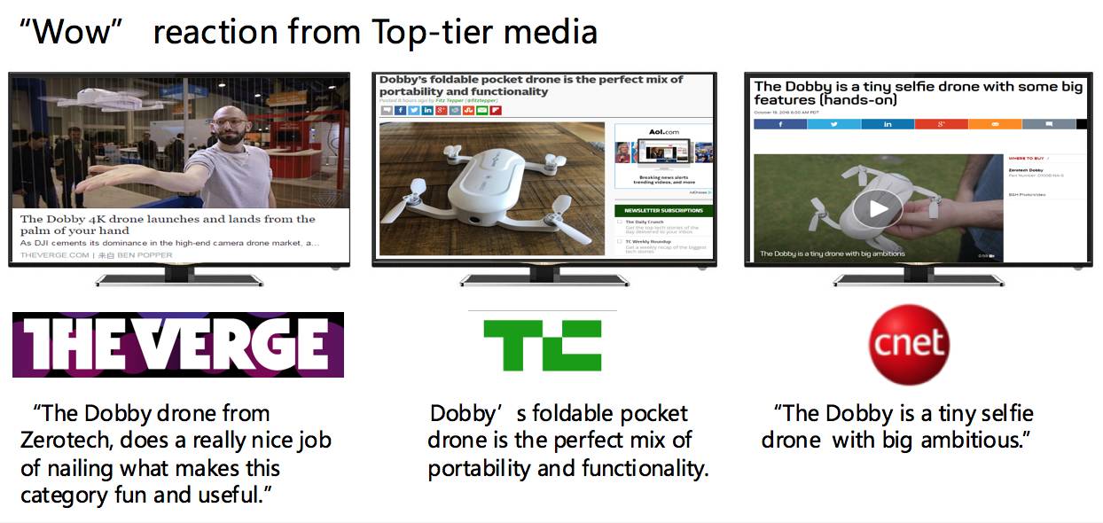 TC注意到了一个无人机目前业态的显著特征,在便携的体积下难以实现完备的功能,而注重便携性的的产品,往往只具有GPS或者只具有室内定位的单一功能。而DOBBY恰恰弥补了这一市场的空白——更注重人与景色的结合,适用于日常拍摄,因此将DOBBY誉为『便携性与功能性』的完美结合。