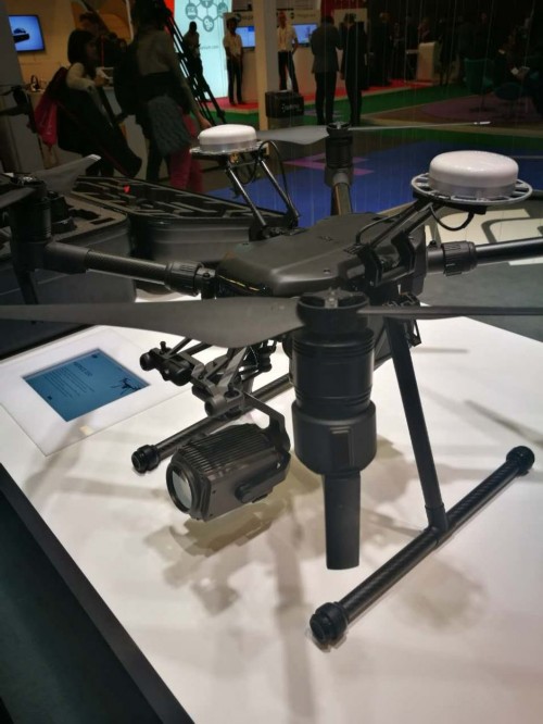 在MWC展馆8号展的E区,记者看到了最新发布的M200。根据介绍,这款无人机首次搭载了双云台,用户可以通过调试安装上置摄像头,实现360度视角拍摄。这种设置更方便需要同时搭载两台相机的检测以及测绘场景。