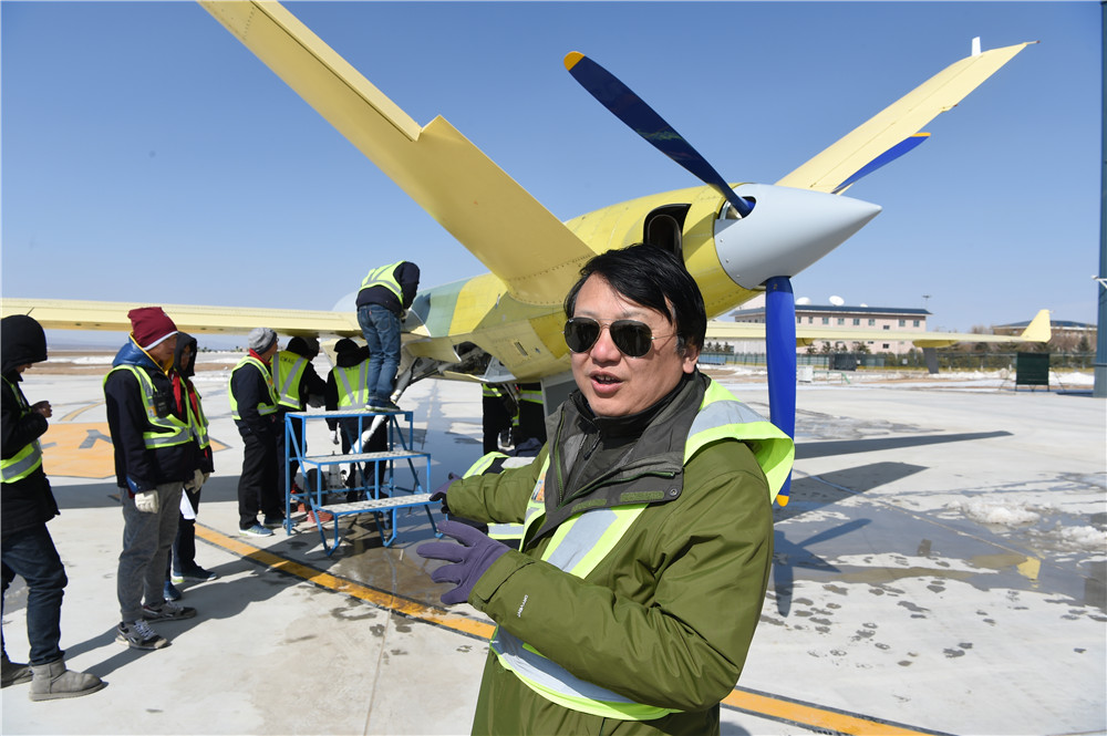 翼龙无人机系统现场总指挥李永光(中)在首飞现场。