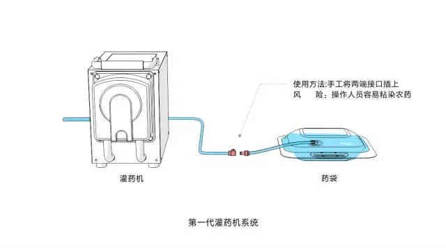 作为市面上从未出现过的产品,没人能告诉我们具体的实际需求,设计师只能通过下地了解作业服务队员的实际作业情况,不断总结需求,做出了早期版本的简便式灌药机。虽然第一代的灌药机已经极大减少了人员与农药接触的机会,但在使用过程中,依然需要人工连接管道接口,因此第一代产品没能 100% 实现人药分离。