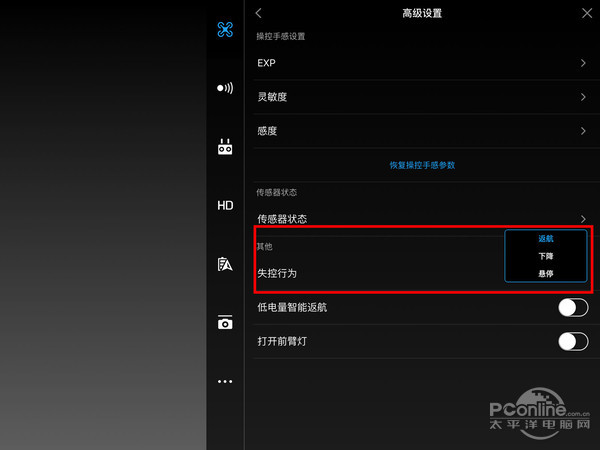 3、设置失联后,自动返航