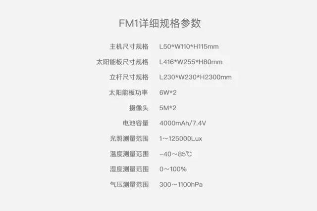 FM1 使用太阳能供电,无需拉设电线,安装的时候仅需 4 颗膨胀螺丝。经研发人员的测试验证,FM1 在15分钟更新一次的频率下能耗最低,内置高容量电池在阴雨天气下也能持续工作 7 天。