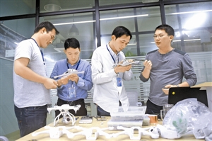 日前,前海疆域智能最新推出的无人机Hornet2获得欧洲产品设计奖(EPDA)金奖。该产品凭借先进的快拆组合设计原理,从安全、效率、功能等多方面让更多用户都可享受到高品质的飞行乐趣。图为疆域智能团队正在组装调试无人机Hornet2。
