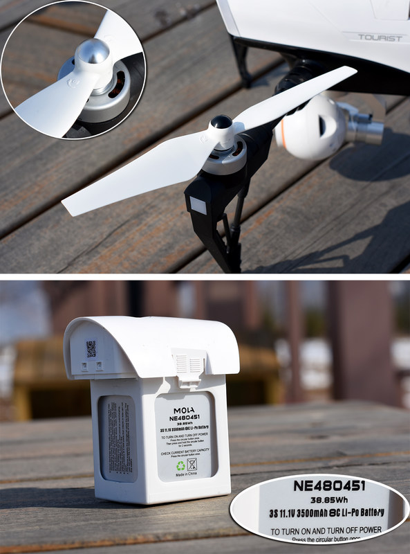 螺旋桨为无保护设计,对于新手来说还是有一定挑战的,每个扇叶均有正反安装标示,安装起来也是轻松了不少,一切为了方便而设计。电池为11.1V、3500Ah 提供理论25分钟的续航,实际飞行视操作习惯和环境温度所关联,由于东北目前还是很冷,所以实测的飞行时间只有十多分钟。