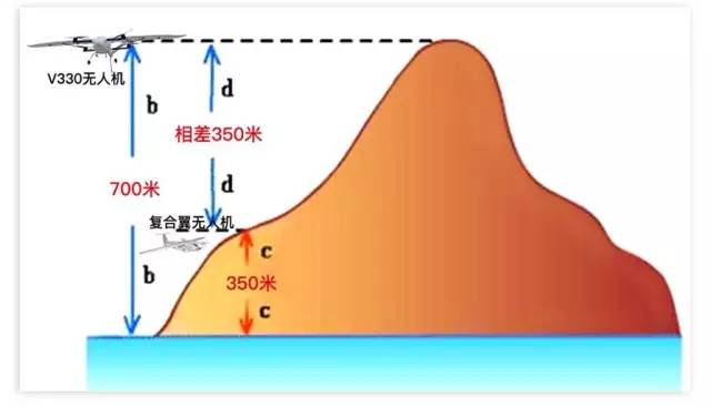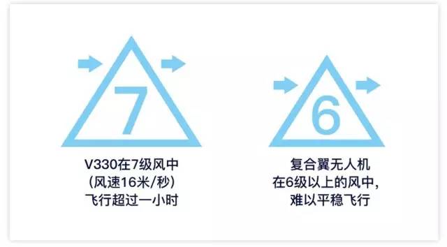 比较市面上其他复合翼,V330双发动力爬升率大,同样测试环境,其他复合翼只能爬升350米,而V330可以轻松爬升到700米,并且在垂直到水平的转换时间短,安全性高。