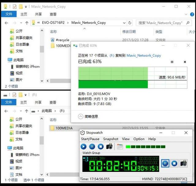 有人可能会疑虑USB Copy的备份速度会没有传统方法快,这完全是瞎操心。在此我准备了一张含有21.6GB超高清航拍视频的32GB雷克沙UHS-I microSD存储卡,分别用电脑和USB Copy进行备份对比。当从电脑的USB 3.0端口插读卡器直接通过千兆以太网把航拍视频复制进NAS硬盘时,整个备份速度稳定在90MB/s,复制过程耗时4分13秒。