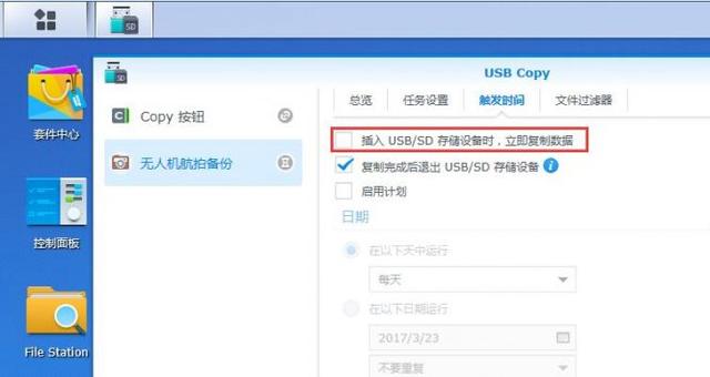 读卡器一经插入,群晖DSM系统就会立刻侦测并识别存储卡,USB Copy可以根据卡设备的不同,可自定义拷贝方案。在备份无人机视频的应用案例里,只需新增一个照片/视频导入方案,为它设定备份的目标文件夹,来源选择“usbshare1”,文件过滤会自动只留下照片和视频,然后记得勾上“插入USB/SD数据时立即复制数据的复选框”,其余设置就不用动了。
