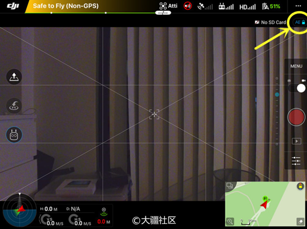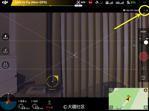 先让拍摄主体入镜,在DJI GO APP屏幕上点击主体,让主体正确暴光,点击屏幕右上角的AE旁边的锁,当锁锁上了,暴光也就锁定了。这时再点击屏幕,测光无效。