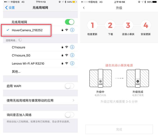 连接上 Hover Camera 之后,App 会自动检测飞机的固件版本,这里有个重大 bug,首次配对时,App 如果检测到新固件,会强制在升级之后才能操作飞机,一个固件居然有近 300MB,在移动网络下下载也要将近十分钟。而飞机如果已经升空的话,有一定的概率被围观人群在垂直避障的机制上推到了空中,在漫长的时间里飞机无法操作也无法降落,只能静静耗完电池。强烈建议 App 加入在移动网络下提示升级固件功能。