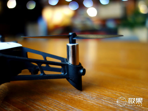 跟其他无人机给我的感觉不同,Parrot Mambo给我第一印象是小巧,18cmX18cm的机身尺寸,我手掌摊开都比Parrot Mambo大。整机颜色采用黑白配,螺旋桨也是黑白各两片,猜测是出于飞行中容易辨别方向。我尝试拆下螺旋桨,无奈有一个死活都拆不下来,最后不小心把马达都拔出来了,这就很尴尬了,幸亏线没断。