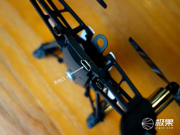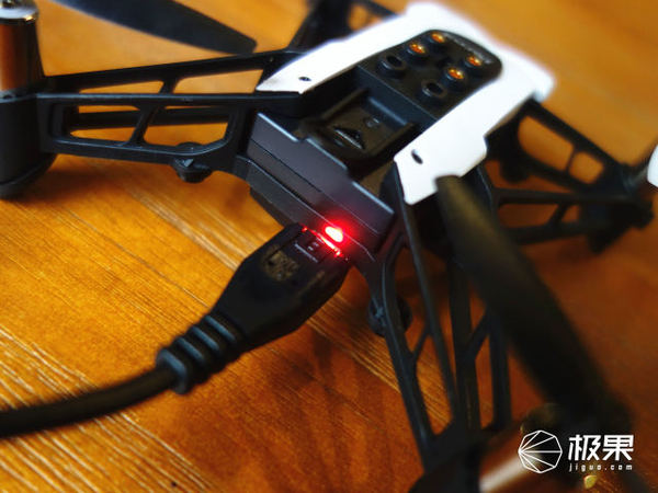 Parrot Mambo采用可更换电池设计,在机身尾部右下角有一个USB充电口,标配只有一条数据线,没有充电头,而且数据线有点短。