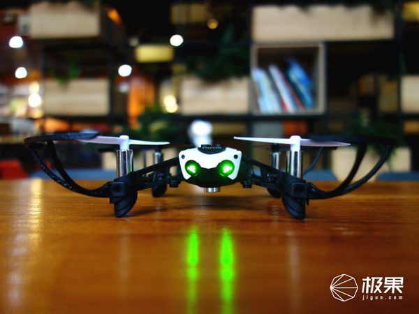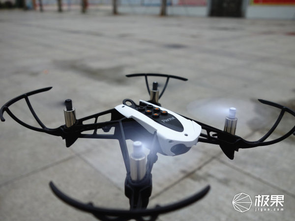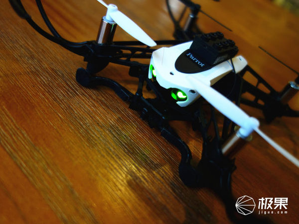 正面的两颗LED灯是Parrot Mambo的灵魂所在,飞行期间会常亮,日间觉得没什么,在漆黑的夜晚是你唯一辨别Parrot Mambo方向和调整位置的地方。满电状态为绿色灯光,电量较少式为红色,刚开机时为橙色,每次都感觉在传递一个信号:报告,已经做好起飞准备。