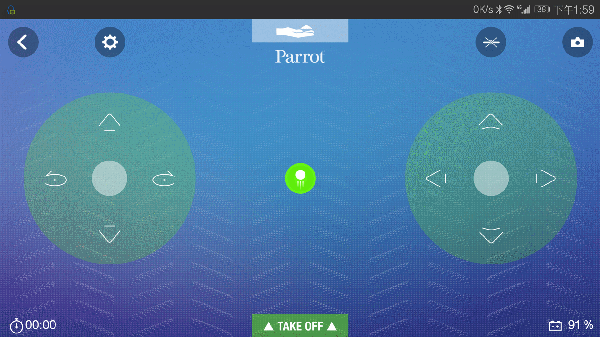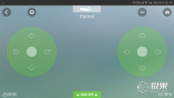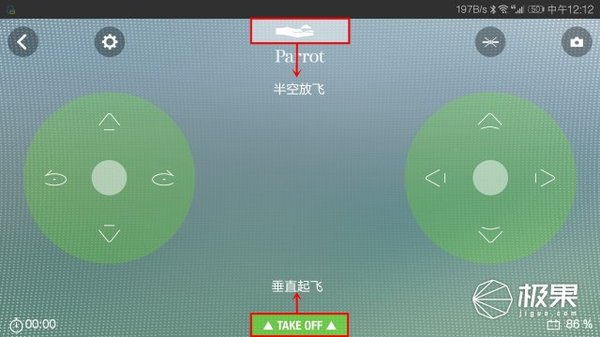 起飞模式也是Parrot Mambo有特点的地方之一,除了平常的垂直起飞,Parrot Mambo还支持半空放飞,平放在手上轻轻一抛就能飞起来。垂直起飞直接点击下方的TAKE OFF标签即可,螺旋桨会旋转迅速起飞;半空放飞模式复杂一些需要先调整水平传感器,螺旋桨会预先旋转,然后再放在手上抛起。起飞之后Parrot Mambo会自身调整进行高度半米左右的悬停状态。