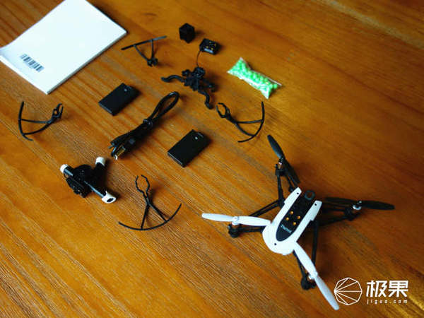 按照惯例不开箱,除了Parrot Mambo无人机主体,其余标配有:数据线、一本厚厚的产品说明书、四个机翼保护壳、机械爪装置、加农炮装置、BB子弹一包、两块电池。要说的是有一块电池是独立包装,因为官方也没有看到配件注明,所以是不是标配不清楚,说明书真的很厚,有多国语言模式,全程图文说明很详细。