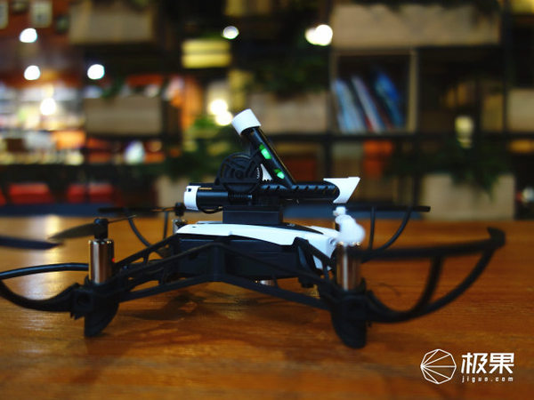 通过背面的模块触点,加农炮可以安装在机身上方,Parrot Mambo直接变身为无人舰载机。斜上位置是弹药槽,最多可以装6发BB弹,装弹需要拆出白色部分的盖口,然后再装上,这样BB弹就不会掉出来。接下来就是操控手机上的发射按钮就可以发射BB弹了。官方说可以打落空纸杯,那是...不可能的,实际上连一张竖着的纸都打不落,没有任何杀伤力。加上没有精准的操控性,你未必打的中,因为无人机悬停会有一些摇摆不定。