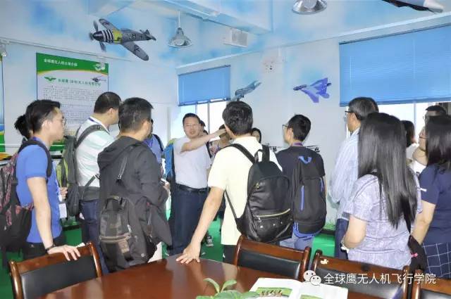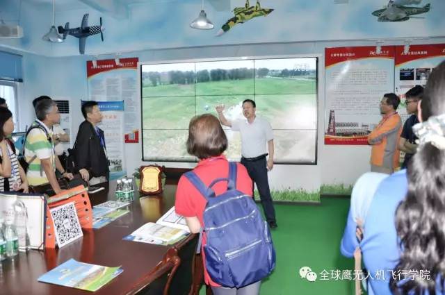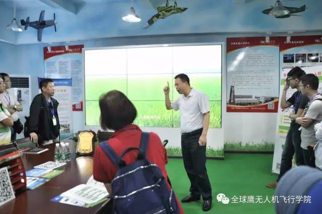 在全球鹰多功能展厅内,余总从全球鹰简介、无人机、无人机应用三个方面向远道而来的老师领导们做了详细介绍。