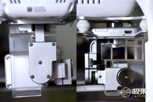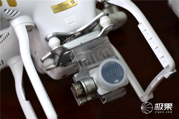 机身的下方是飞行器的一体式相机云台,为了保护运输过程中的颠簸,云台中间使用了塑料支架所谓锁扣,镜头上则安装有橡胶材质的镜头盖。