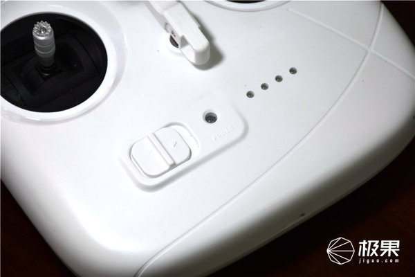 遥控器顶部的左侧为飞行器的云台俯仰拨轮。