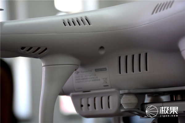 另外,在P3 SE的机身上,我们可以看到很多散热孔。包括机臂的上下面、机身的左右两侧、机尾等都有对称的散热孔分布。